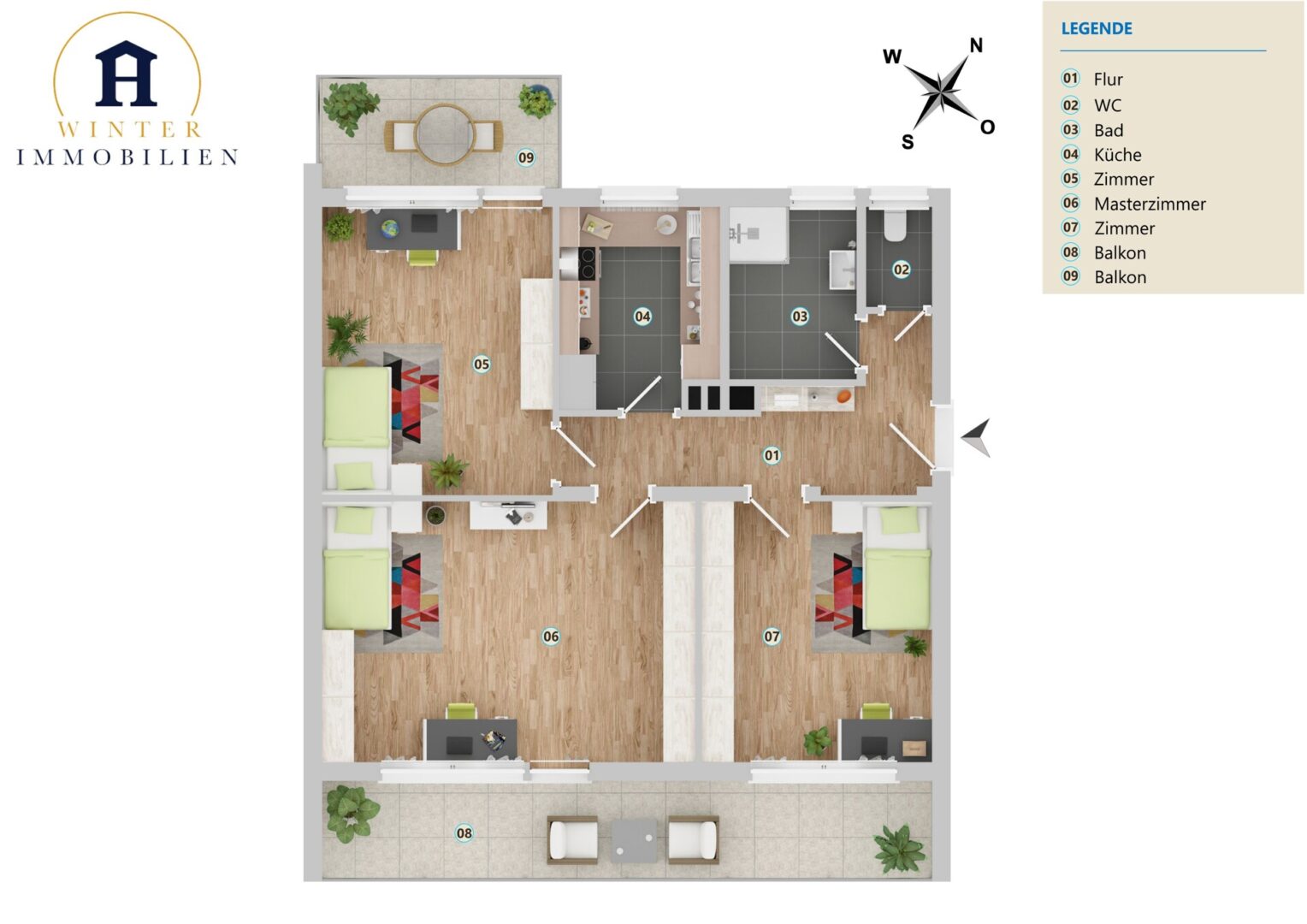 Besonders attraktiv sind die Außenflächen: Sowohl zwei Balkone als auch eine Terrasse bieten zusätzlichen Raum im Freien – für entspannte Stunden, Frühstück in der Sonne oder gesellige Abende. Das Objekt ist zudem unterkellert und bietet damit weiteren Stauraum.